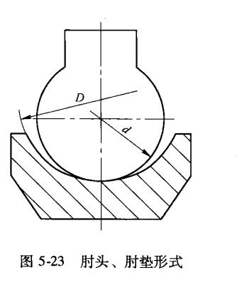 肘頭與肘墊的結(jié)構(gòu)形式,一般有兩種:滾動型(滾動副)和滑動型(滑動副),如圖5-21所示現(xiàn)以滾動型為例,說明肘頭與肘墊相對運(yùn)動與受力情況(圖5-22)。在破碎機(jī)工作時,破碎力的分力,經(jīng)肘墊壓向肘板最后由肘墊C支撐。與此同時,動顎通過肘墊給肘板一個擺動力矩M,在此力矩作用下,肘板繞著C點(diǎn),從極限位置B1擺到極限位置B2在位置B1時,肘頭滾到△點(diǎn)與肘墊接觸;在位置B2時,肘頭滾到O點(diǎn)與肘墊接觸,如此往返運(yùn)動。變肘頭與肘墊滑動型為滾動(圖5-23),根據(jù)對肘頭與肘墊相對運(yùn)動分析可知若D越大,肘頭在肘墊里滾動運(yùn)動的區(qū)域也越大;若D-d越小,則肘頭在肘墊里滾動D的區(qū)域也越?。蝗鬌-d很小,即采用配合尺寸,則肘頭在肘墊里幾乎處于完全滑動此為滑動副;若一“大到一定程度,可變滑動為滾動,一般可取D-dD=0.35~0.4即可(圖5-23)。